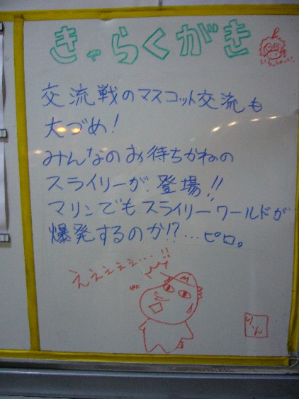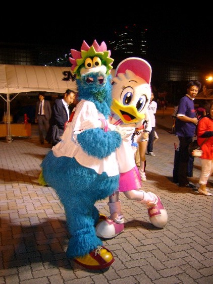 とにかくスラ様目当てということで3塁側に座ったのですが、周りが広島ファン、広島ファン、広島ファン…しかも熱烈な!という感じで、試合が負けていたこともあり、ラッキーセブンで素敵なスラ様の一人ダンスを堪能した後はしおしおと1塁側へ移動することに。広島ファンはほんとに熱心で、マリンのビジター用外野席がぎっちり満席になって、しかもロッテのあの応援を上回る声援なんて初めて見ました。すげーや。平日でっせお客さん。その中で一人天衣無縫にフィールドで腰を振り振り歩き回るスラィリー(笑)。チアも引きつれずひとりぼっちなのになぜかまったく悲壮感のないスラィリー。なぜスラ様があれだけ巨大で毛むくじゃらで強烈なお姿をしていらっしゃるのかよくわかりました。一人であれだけのインパクトを与えられるマスコットなんて他にいねえや。