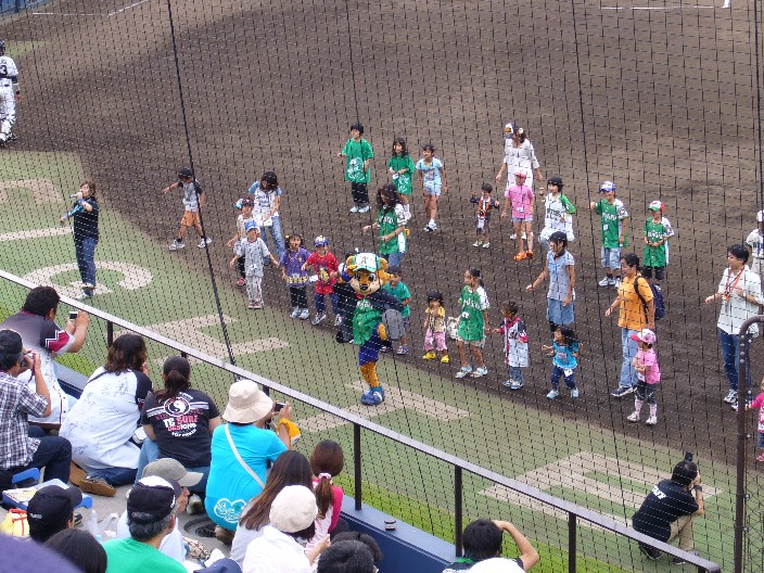 あと、序盤の2回であっという間に3点とられてしょんぼりムードだった1塁側(ビジターが1塁側でした)が、GoGoオオツカアキラ!で一気に盛り上がっちゃったのには笑いました。あれ私初めて見たかも。振り付けがちょっと可愛かったv 横須賀と同じで、向こうさんにはしっかりとした応援団がいたのですが、さすが地元千葉というべきか今度はロッテファンが半分くらい居たので、竹原・神戸・ランビンあたりの応援歌が特に決まったリードもなく何度もあちこちから沸いてきてそれなりに応援合戦になっていたのは面白かったです。